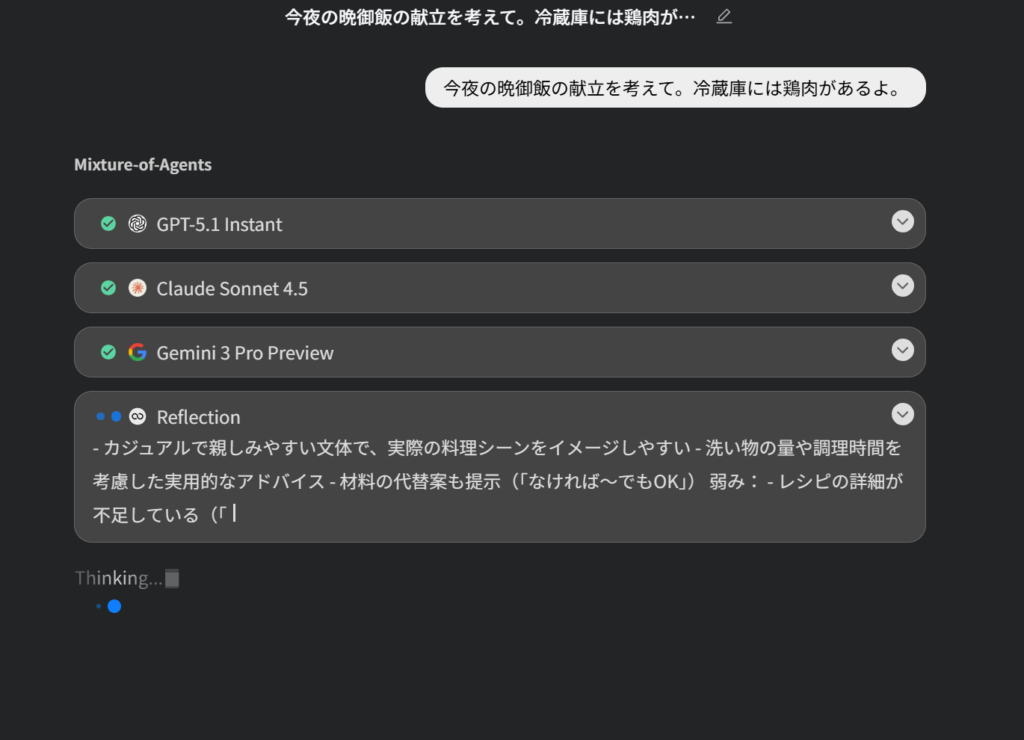 たとえば「今夜の晩御飯の献立を教えて」と聞いたとき、単一のAIが答えるよりも、複数のモデルが多角的な視点から検証した統合回答が得られます。
